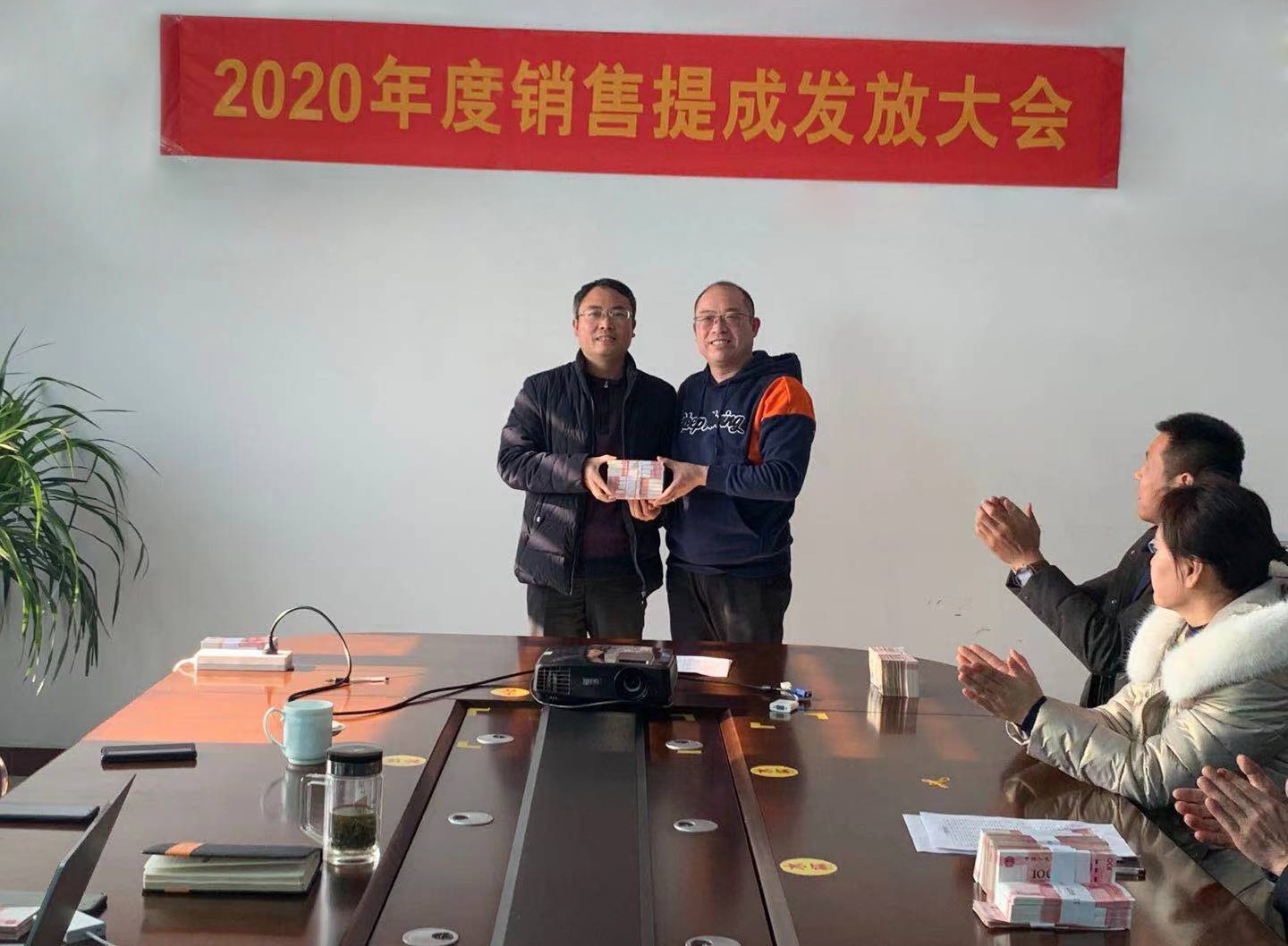 2021年1月2日,上午11點30分左右,河北鎂神科技股份有限公司在會議室召開業(yè)務(wù)員提成發(fā)放大會。一摞摞的紅色人民幣整齊的擺放在桌子上,看著格外的喜慶。業(yè)務(wù)員領(lǐng)到提成現(xiàn)金,大家都喜笑顏開。